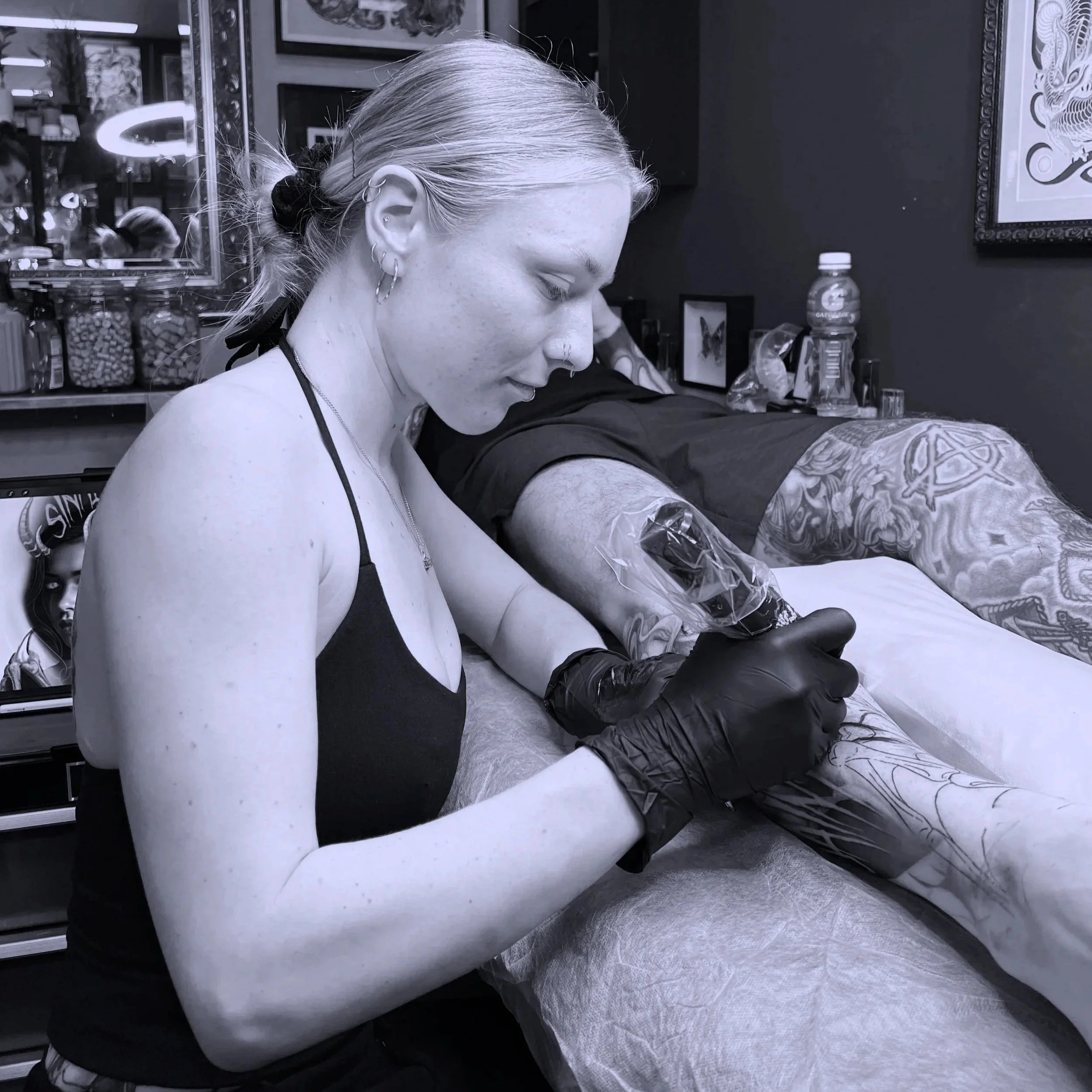 Haylie loves bold blackwork, with a style that leans towards the witchy and ornamental. Hand tattoos and full-scale back pieces are her absolute favourite to create.